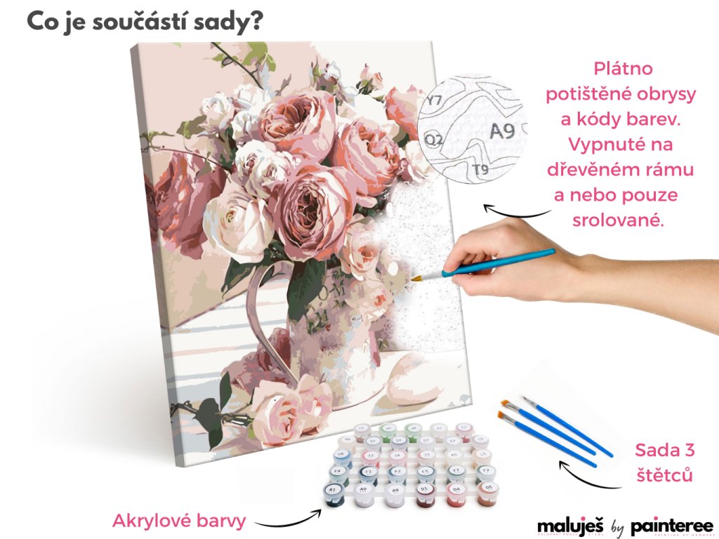 Kvalitní plátno natažené na dřevěném rámu (100% smrkové dřevo), štětce a vysoce kvalitní akrylové barvy - Váš obraz se stane skutečným uměleckým dílem!