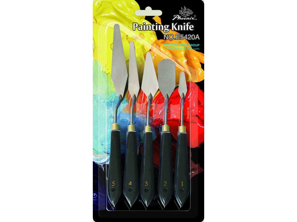 Sada malířských špachtlí značky Phoenix z nerezové oceli a masivní dřevěné lakované rukojeti, pro použití při strukturované malbě, míchání barev, apod. Délka špachtlí je přibližně 20 cm dle ocelové části. Sada se skládá z 5 různých tvarů, jednotlivé typy můžete vidět z fotky produktu.